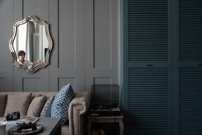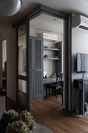 Tất cả sự hoàn thiện này mất khoảng 3-4 tháng vì phải mất thời gian sửa sang lại căn phòng trước khi giao để trang trí vì vấn đề mối mọt. Ngoài ra, do gạch nhẹ của chung cư có chất lượng tốt nên rất khó vỡ, mất thời gian. Về phần kinh phí, nó nằm trong ngưỡng quy định là 1 triệu baht, một phần là do nhà thiết kế đã nỗ lực mix and match. Ví dụ, trong nhà bếp có một lựa chọn hình nền. Nội thất khá đồng điệu nên tiết kiệm được kinh phí. Tập trung vào việc sử dụng những gì bạn đã có. Ví dụ, phòng tắm chỉ thêm đèn.