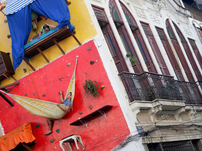 Căn nhà thẳng đứng là tác phẩm của 2 anh em nghệ sĩ người Brazil, người em tên là Tiago Primo (phía trên) và người anh tên Gabriel. Họ đã xây dựng một ngôi nhà thẳng đứng trên bức tường leo núi Rio de Janeiro, căn nhà có đầy đủ các vật dụng như: giường, võng, ghế, kệ để đồ, tủ…Riêng nhà tắm và vệ sinh thì có lẽ phải đi nhờ nơi khác.