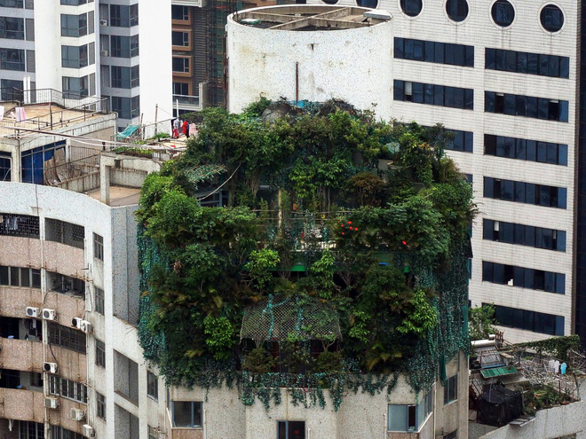 Căn nhà này được phủ xanh toàn bộ bằng thảm thực vật xanh mát, nằm tọa lạc tại đỉnh một tòa nhà 19 tầng tại tỉnh Quảng Châu- Trung Quốc. Căn nhà này được xây dựng khá lâu trước đó, cho đến ngày nay vẫn chưa rõ ai là người đã tạo nên kiến trúc độc đáo này.
