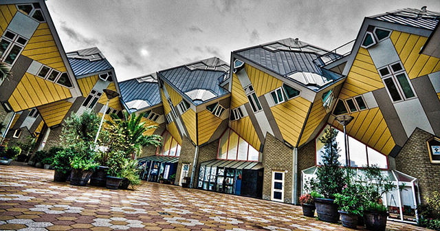 Hệ thống dãy nhà được thiết kế với hình dạng là những khối lập phương kỳ quái tại Rotterdam và Helmond, sử dụng màu vàng nổi bật, phần trên cùng ngôi nhà được đặt nghiêng 45 độ tạo ảo giác cho người nhìn. Đây là công trình kiến trúc của kiến trúc sư người Hà Lan tên Piet Bloom. Nhờ thiết kế lập phương giúp căn nhà có thể lấy sáng từ khắp các hướng, đây cũng là điểm thu hút khách du lịch đông đảo tại Hà Lan.