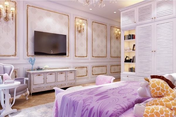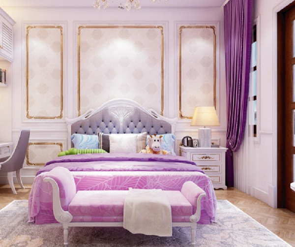 Không những tường, trần được trang trí theo phong cách hoàng gia mà ngay cả các vật dụng trong phòng như tủ, đèn bàn, ghế, màn cửa…cũng có thiết kế và màu sắc vô cùng đồng nhất. Tất cả kết hợp tạo nên không gian vô cùng hài hòa, một căn phòng ngủ màu tím là mơ ước của biết bao cô gái.