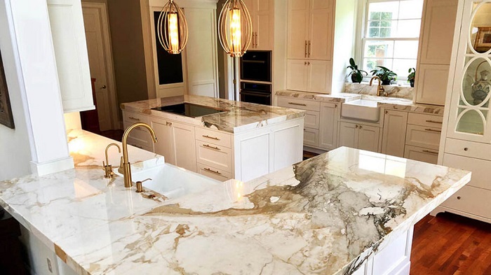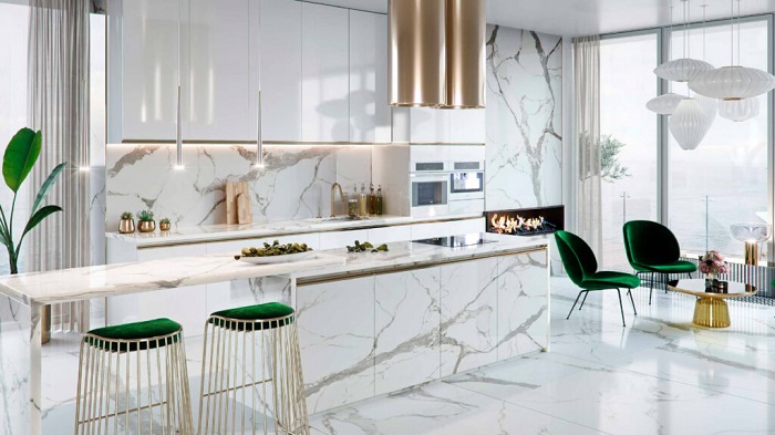 Đá cẩm thạch là điểm thu hút hàng đầu để tạo ra các thiết kế sang trọng vì vẻ đẹp và sự sang trọng vượt thời gian của nó. Các nhà thiết kế và người nội trợ thích đá cẩm thạch với một vài hiệu ứng bóng mờ. Nó không chỉ truyền tải cảm giác giàu có mà còn tương phản đẹp mắt với nhiều phần trang trí nội thất khác, chẳng hạn như vòi nước bằng gỗ, thép và bề mặt bóng bẩy. Kết quả là, đá cẩm thạch chắc chắn được săn đón cho các thiết kế nhà bếp do đặc tính hợp thời trang và bắt mắt của nó.