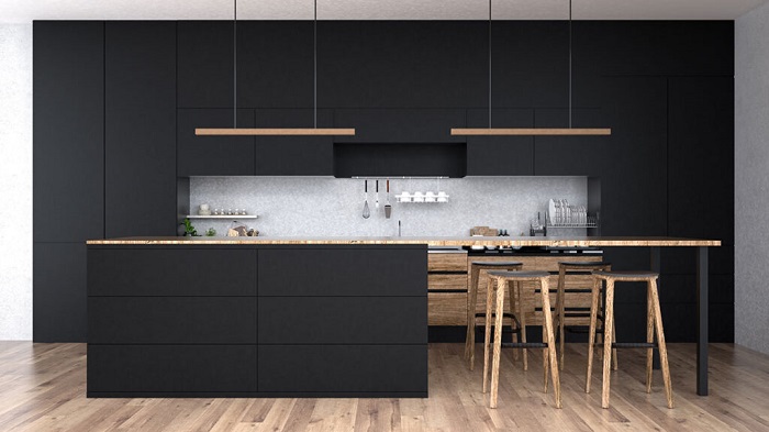 Trong khi nhà bếp màu trắng vẫn hấp dẫn, nhà bếp màu đen đang leo lên bậc thang xu hướng do sự hấp dẫn kiểu dáng đẹp và tối của chúng. Nhà bếp toàn màu đen mang đến cảm giác say mê, sang trọng và tâm trạng. Điều mà ai đó có tâm hồn phong phú hoặc nghiêm túc sẽ muốn xem xét. Màu đen có thể tạo ra một bầu không khí ấm cúng hơn trong khi vẫn mãnh liệt, bóng bẩy và tinh tế. Việc bao gồm các màu sắc khác, chẳng hạn như màu trắng, đối lập với màu đen, có thể làm phong phú thêm sự quyến rũ của căn phòng.